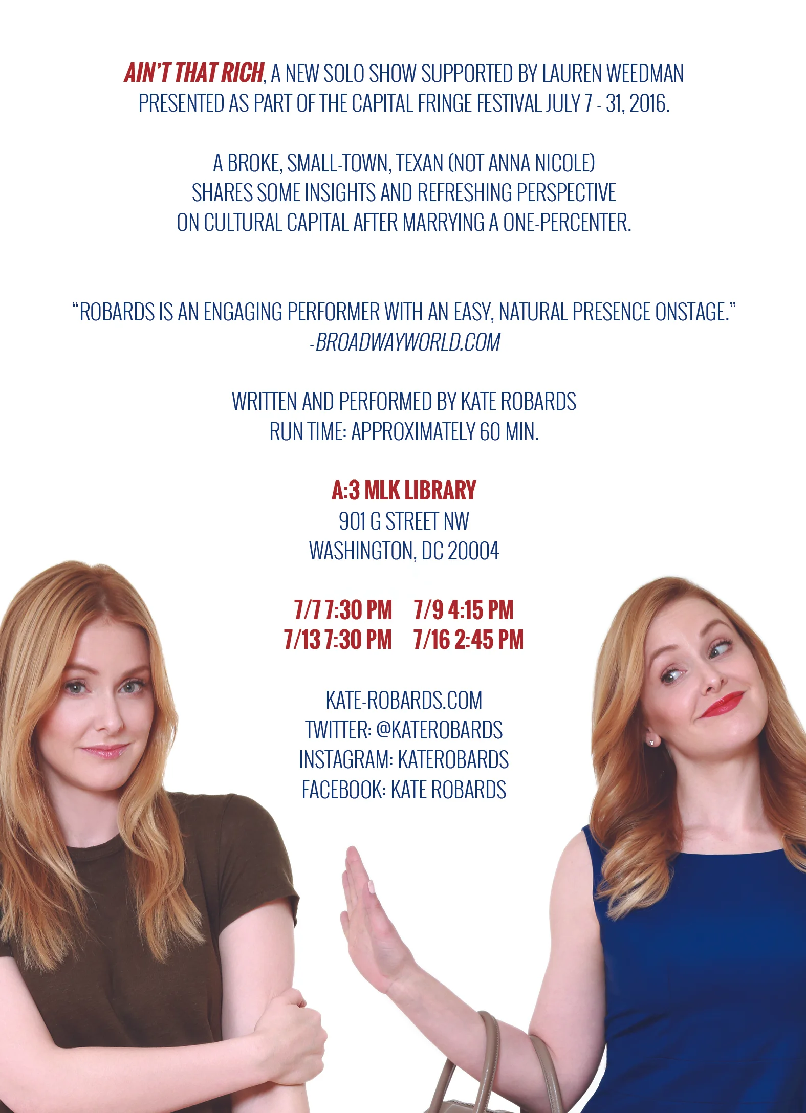 Katherine Robards is a writer and performer. Her first solo play Mandarin Orange premiered in Washington, D.C. where it was a named a "Fringe Festival highlight," by The Washington Post and "Pick of the week" by The Washington Times. In Maui, Kate was awarded the Hoku Award for favorite performer. She performed a benefit of the play for Orange Community Players and raised thousands of dollars for the non-profit theatre. Her one-act-play, Madame Pearl, ran at CCA’s Orange Box Play Space in San Francisco. Her second solo play, Ain’t That Rich, will debut at Capital Fringe Fest in July 2016. It is developed with assistance from Solo Sundays at Stage Werx in San Francisco.