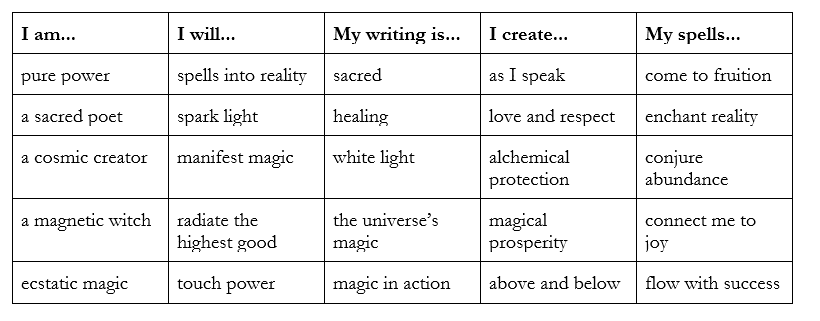 Underneath the chart, write out the phrase ten times. Decorate the page with lines, shapes, filigrees, or colored highlighters. Make the affirmation stand out on the page. Read and admire your blessed work. Repeat it back to yourself. Eventually, you might even want to transfer your sacred affirmations to your grimoire. And viola! Then your affirmations are ready to join you for rituals, spell-casting, and magical poetry writing.