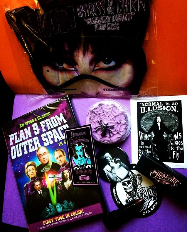 I decided to try out Creeper Crate by ordering a "Queens of Macabre" box. When it arrived, I happily found a box that contained a full sized lipstick in the shade "Slay" by Suavecita Pomade, an Elvira sleep mask by Kreepsville 666, pocket-sized mirror with the image of the Bride of Frankenstein, a lovely sticker featuring Morticia Addams, a grapefruit scented spider-in-web bath bomb by Brutal Bathory, an exclusive Lily Munster pin by Demonic Pinfestation and a DVD of Ed Wood’s classic B-horror film, Plan 9 from Outer Space, which is touted as one of the worst films ever made, and features Maila Nurmi of Vampira fame.