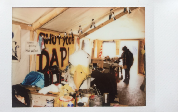 She’s one of two women running an art space where water protectors can spray paint signs or silkscreen “Mni Wiconi” patches for those on the frontline. Peeking inside the tent, I spot a huge, handmade yellow and white paper mache eagle head — a neatly striking convergence of the art, activism, and culture that can be found here.