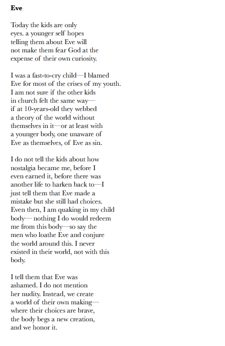 Hayley Brooks is a poet based in St Paul, Minnesota who received her B.A. in English writing from Goshen College. Her poetry focuses on reframing trauma and shifting from body/soul dichotomies to body- and gynocentric narratives. She has previous work published in Lavender Review, The Mennonite, Our Stories Untold and Lipstick Party Magazine. Visit hayleyjbrooks.comfor more of her work.