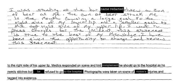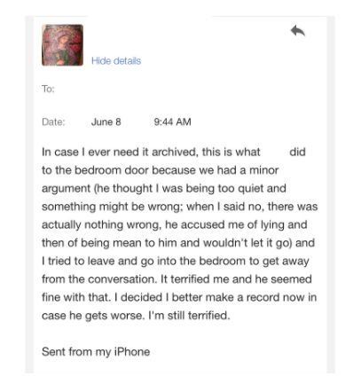 I tried to talk to Cas about this once; his reaction was to lash out. I interpreted his aggression as hurt feelings, and never brought up the topic again. But, as Audre Lorde observed so many decades ago, “My silences had not protected me. Your silence will not protect you.” This proved literally true: one morning, a little over a year into our marriage, Cas asked me why I was being so quiet. Surprised, I reassured him several times that nothing was wrong, that I was simply drinking coffee and hanging out with him in our living room on an early weekend morning, and didn’t have much to say. Cas, who had already consumed several shots of bourbon, began to scream at me that I was weaponizing my silence in order to punish him for some imagined offense. After several attempts to reiterate that nothing was wrong, and that I was not upset with him, I got up and went into the bedroom. I heard Cas get up to follow me into the bedroom. I was scared; I locked the door. Cas punched through the door. Terrified, I tried to leave. Cas blocked the path to our apartment door with his body and asked me in a very quiet voice not to go. He said that the door shouldn’t have caved under his fist like that, that it was poorly made. That I shouldn’t have locked the door, because he had the right to go into any room of his house that he wanted. Terrified, I agreed to stay.
