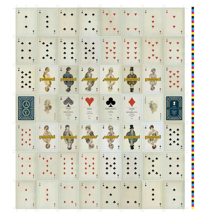 Aces represent Pride and Prejudice; Hearts display Emma; Clubs detail Persuasion; and Diamonds showcase Sense and Sensibility.