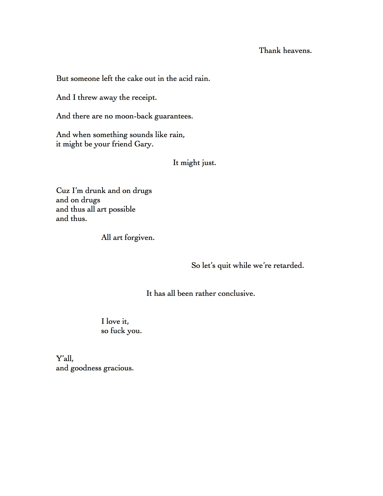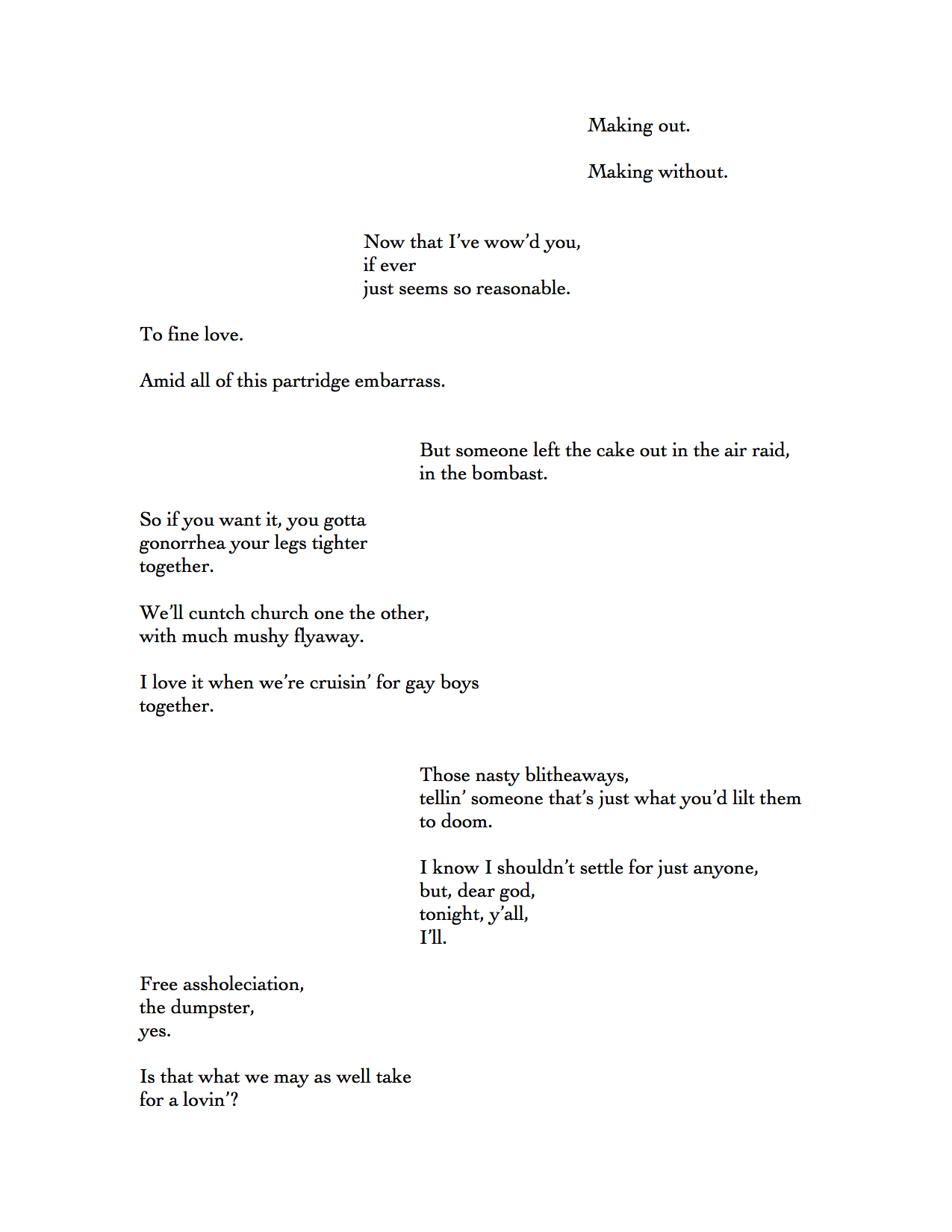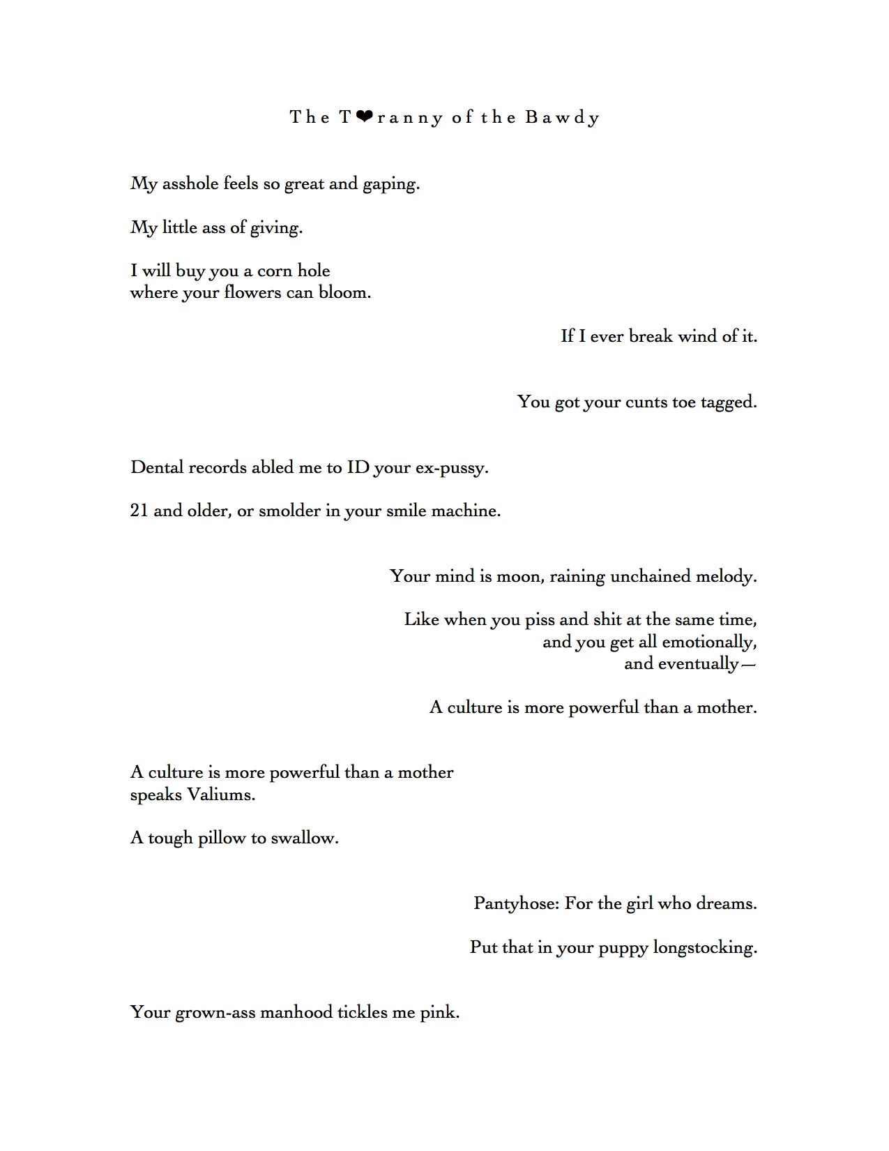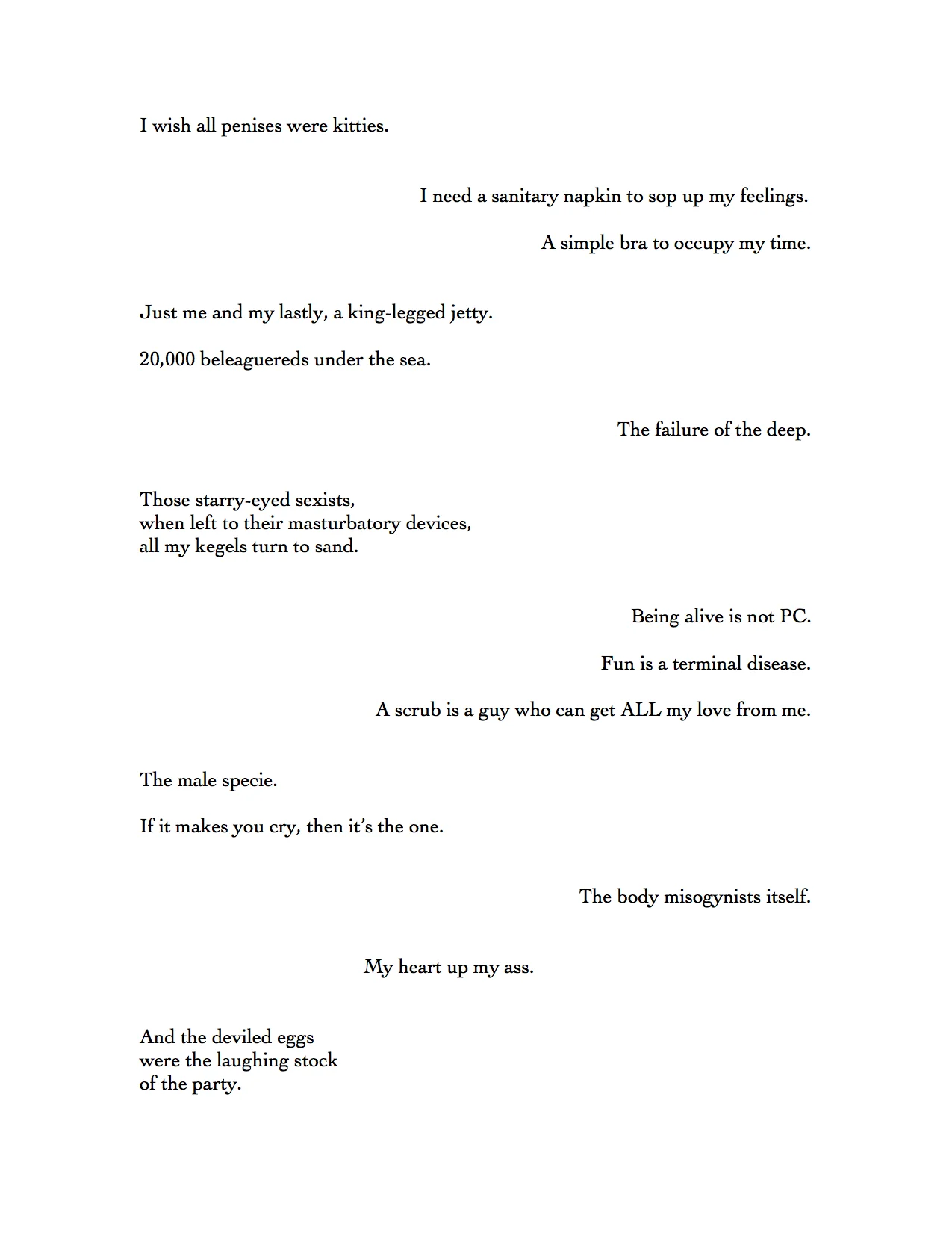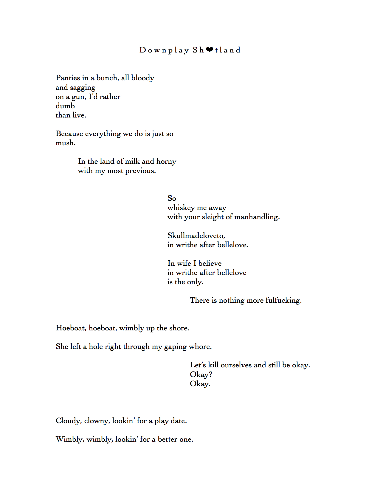 Kim Vodicka is the author of Aesthesia Balderdash (Trembling Pillow Press, 2012). A freelance writer and teacher by day, she moonlights as the spokesbitch of a degeneration. Her poems, art, and other projects have appeared in or are forthcoming from Shampoo, Spork, RealPoetik, Cloudheavy Zine, THEthe Poetry, Women Poets Wearing Sweatpants, Epiphany, Industrial Lunch, Moss Trill, Smoking Glue Gun, Paper Darts, The Volta, Queen Mob’s Teahouse, Makeout Creek, The Electric Gurlesque, Best American Experimental Writing (BAX) 2015, and many others. Her manuscript, Psychic Privates, was a 2015 Tarpaulin Sky Book Prize Finalist. Cruise more of her work at ih8kimvodicka.tumblr.com.
