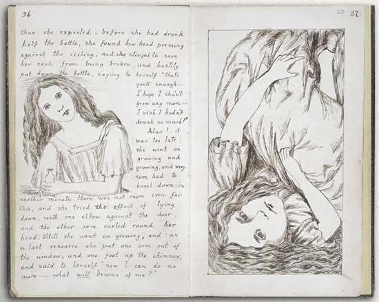 I went to London for the first time last winter, and I stumbled upon a new kind of Alice, or rather, the Alice I never knew about. After a beautiful cafe lunch at The British Library with my sister Miranda, we decided to head over to see the many different manuscripts of Alice’s Adventures in Wonderland that were on display. The books, entombed in glass cases, wrapped around each other whimsically like a caterpillar. Because of the small, but fervent crowd, I went through the exhibit in reverse and was stunned when I got to the end, or should I say the beginning of the Alice exhibit.