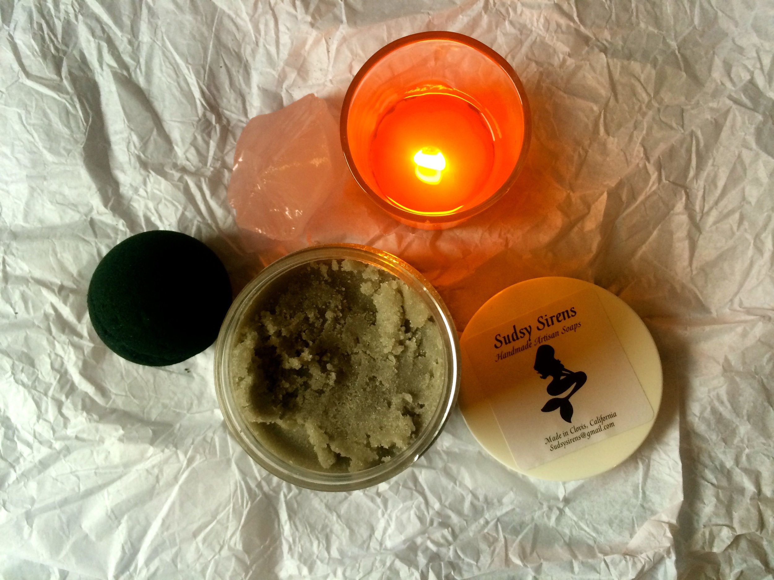 I used the Patchouli Rose Scrub and black bath bomb from the Coven Collection during a nighttime ritual bath for protection. The shimmery black bomb dissolves into an emerald green, the black foaming out to the periphery of the bathtub. This bomb contains top notes of lemon, pear, lemon peel, pear, eucalyptus and pine mixed with notes of cinnamon, wisteria, jasmine, and clove over a vanilla, and cedar wood. The amalgamation of these many were surprisingly serene and would also be helpful when speaking your intentions for a new moon cycle. After lighting candles and turning the lights off, I could still see the dark hues in the water. The Patchouli Rose whipped vegan sugar scrub is a smoky gray color and compliments the bath bomb beautifully. It has the texture of sandy clay. Like the mermaid scrub, it left my skin feeling moisturized, but not greasy and the scrub was easy to wash off. To my delight, my skin was left with little bits of glitter from the bomb.