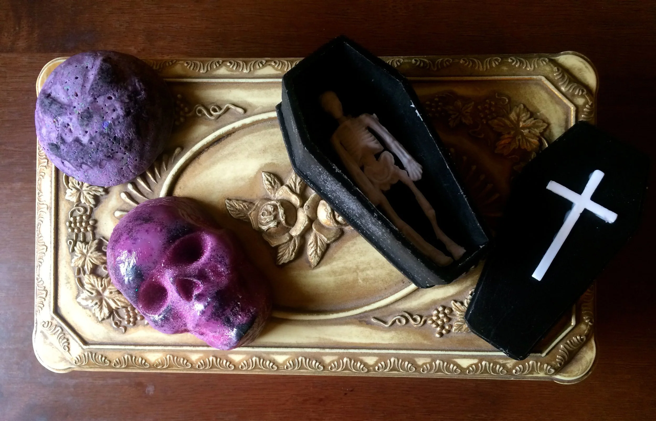 I have to write them down. I have a long list of things I’m going to do and I’m going to come out with, but I have to slow down because they’re so many products already. I enjoy what I do. I get ideas from everything I see. Especially music. I made these black bath bombs in the shape of skulls, then made soap in the shape of diamonds and put them in their eyes. They remind me of the Def Tones song, “Diamond Eyes.” I also made a coffins bath bomb with a skull wearing a top hat. He was all done up and I thought, he looks like Slash from Guns and Roses or the skull face from Gothic Alchemy.