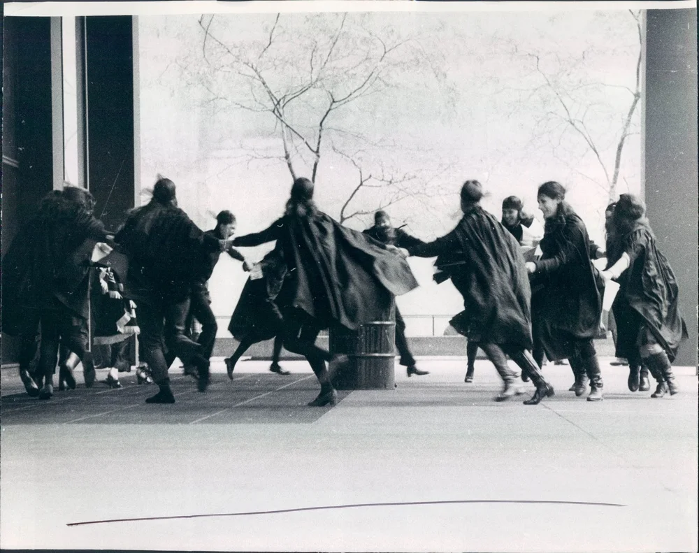The group declared the witch as their symbol and used the dramatic tactics of guerrilla performance and costume in their protests. Notably, on their inaugural action, members dressed up as witches and marched down Wall Street putting a hex on New York’s patriarchal and capitalist financial district. They would distribute garlic cloves and cards with the motto, “We Are Witch We Are Women We Are Liberation We Are We." They would storm restaurants with brooms and black hats to chant, “Nine Million Women, Burned as Witches.” The chant a nod to the European witchcraft trails but an erroneous and inaccurate number claimed by many. Clearly a figure meant to shock if anything.