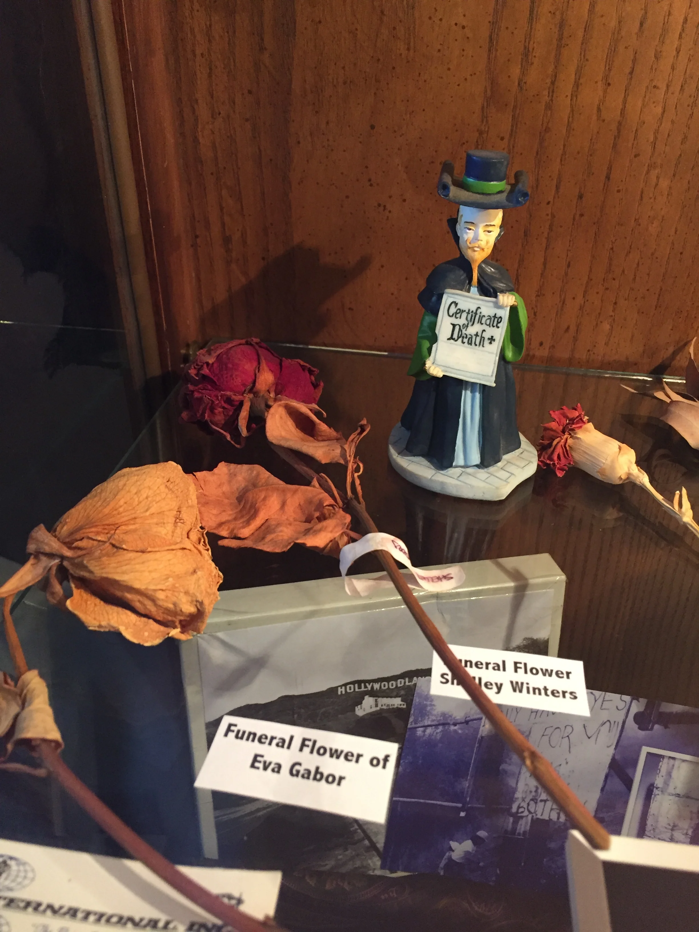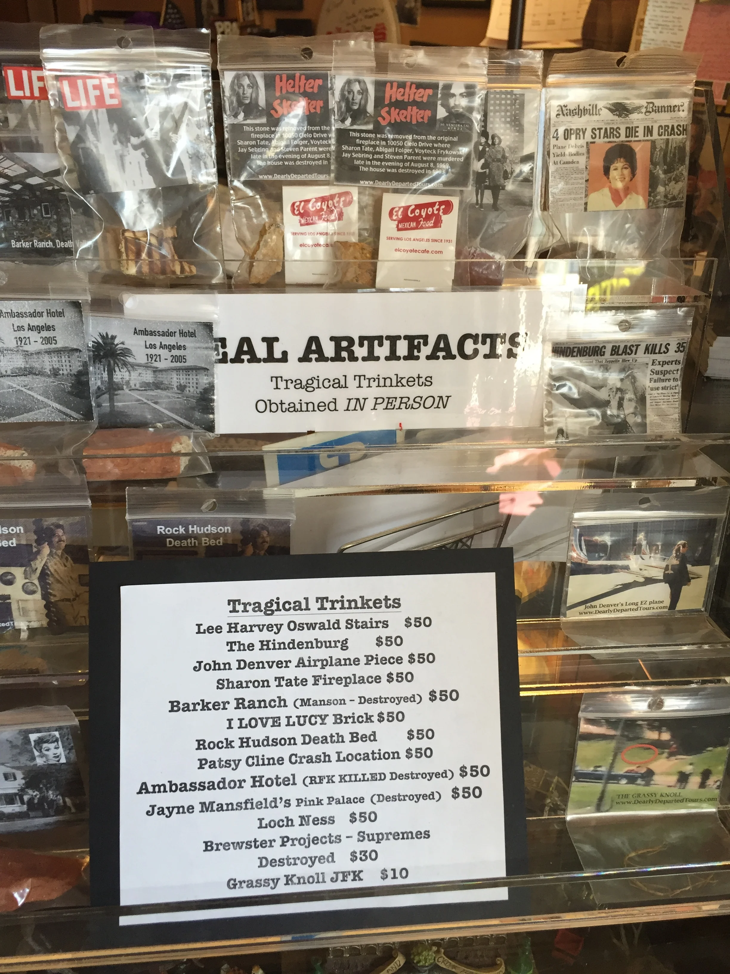 I thought about this childhood fascination with graveyards and my collecting of the dead’s pennies on a recent trip to Los Angeles when I partook in the Dearly Departed Tour. The tour’s main office is headquartered in Hollywood and, as their website states, remains Tinseltown’s "authoritative celebrity death source." My fiancé, Aaron, and I were in town visiting family and my future in-laws booked the tour as part of Aaron’s birthday celebration. I couldn’t have been more delighted—it may as well have been my own birthday. Yet, upon entering into the office I began to feel immediately ambivalent. We arrived early and the owner invited us to wander around the shop, which doubled as a museum, and explore his collection of tokens from Hollywood icons’ troubled lives and last moments.