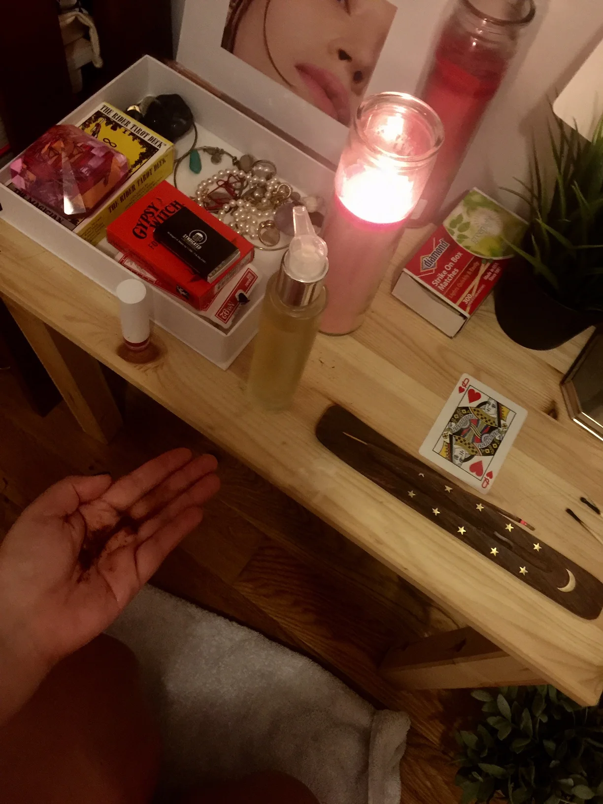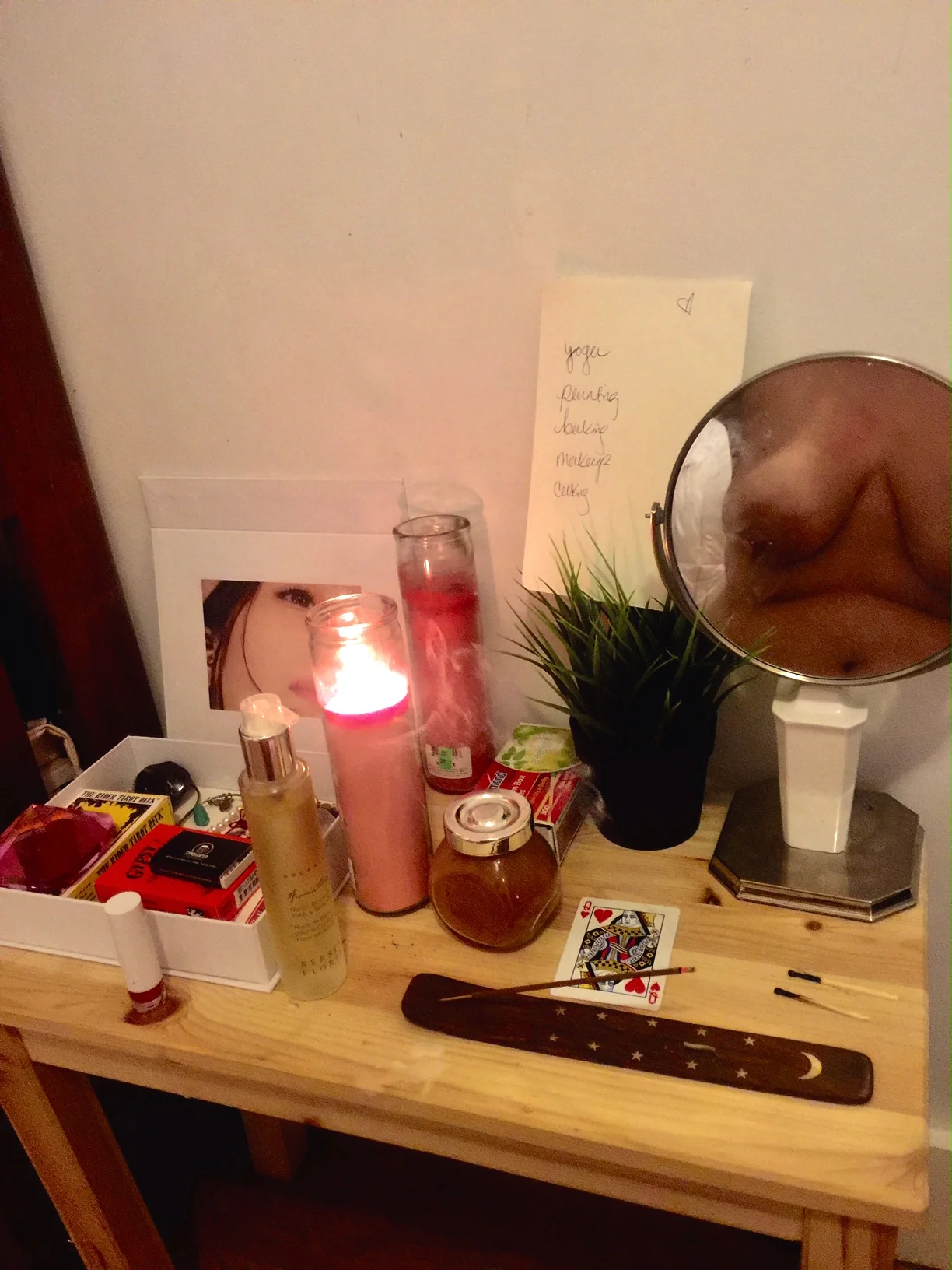Remove as much or as little clothes that makes you feel comfortable. If you can do fully nude, wonderful — if not, also wonderful. I tend to like doing this spell in my underwear and topless so that I can draw more attention to my midsection and heart. Adorn yourself with any jewelry or physical symbols of confidence. For example: I apply the brightest red lipstick I own.