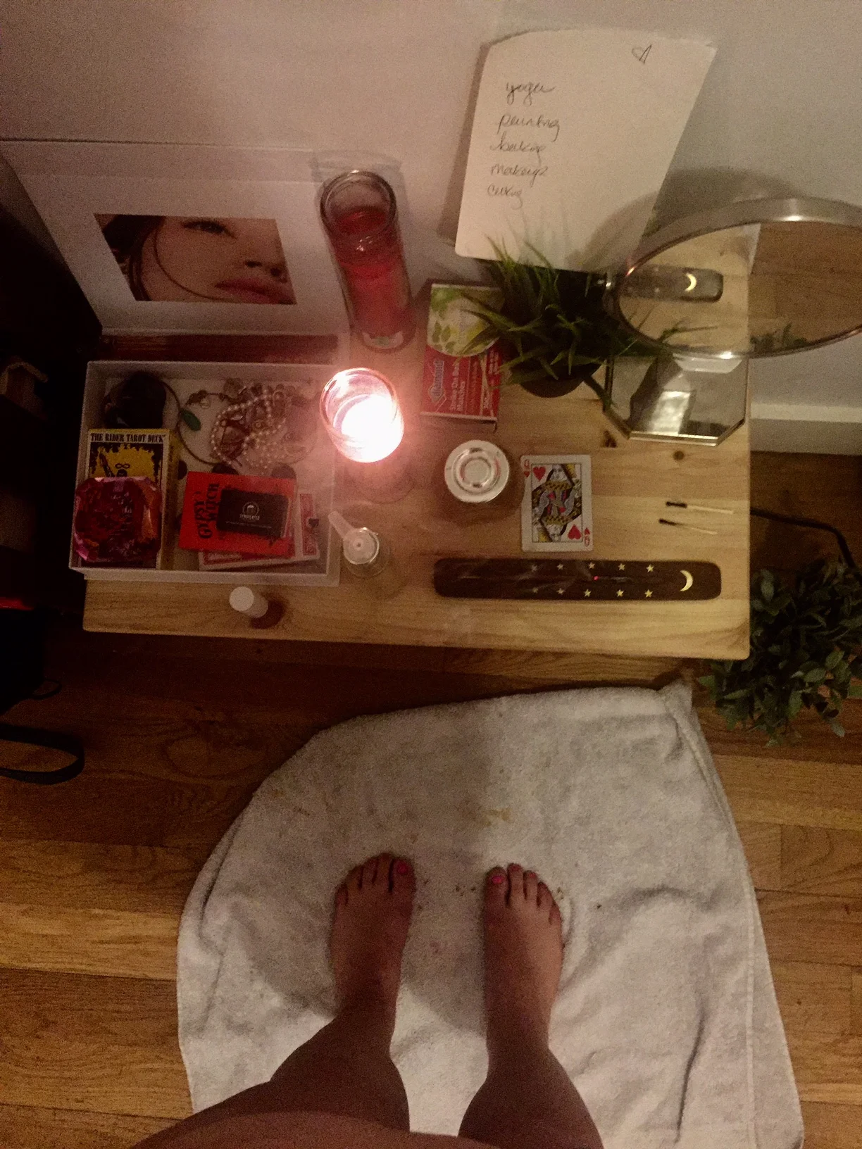 Light a pink candle and place it in front of the mat. If you do not have a pink candle, light any candle and put a pink object next to or under the frame (sometimes I’ll rip out a section of a magazine that as the aesthetic I want to invoke). This candle represents the transition into loving and accepting yourself. Grab your pen and a piece of paper, and write down 3-5 things you enjoy doing. Fold the paper and place in front of you. Here are mine: painting, making breakfast, yoga, playing with makeup, baking.