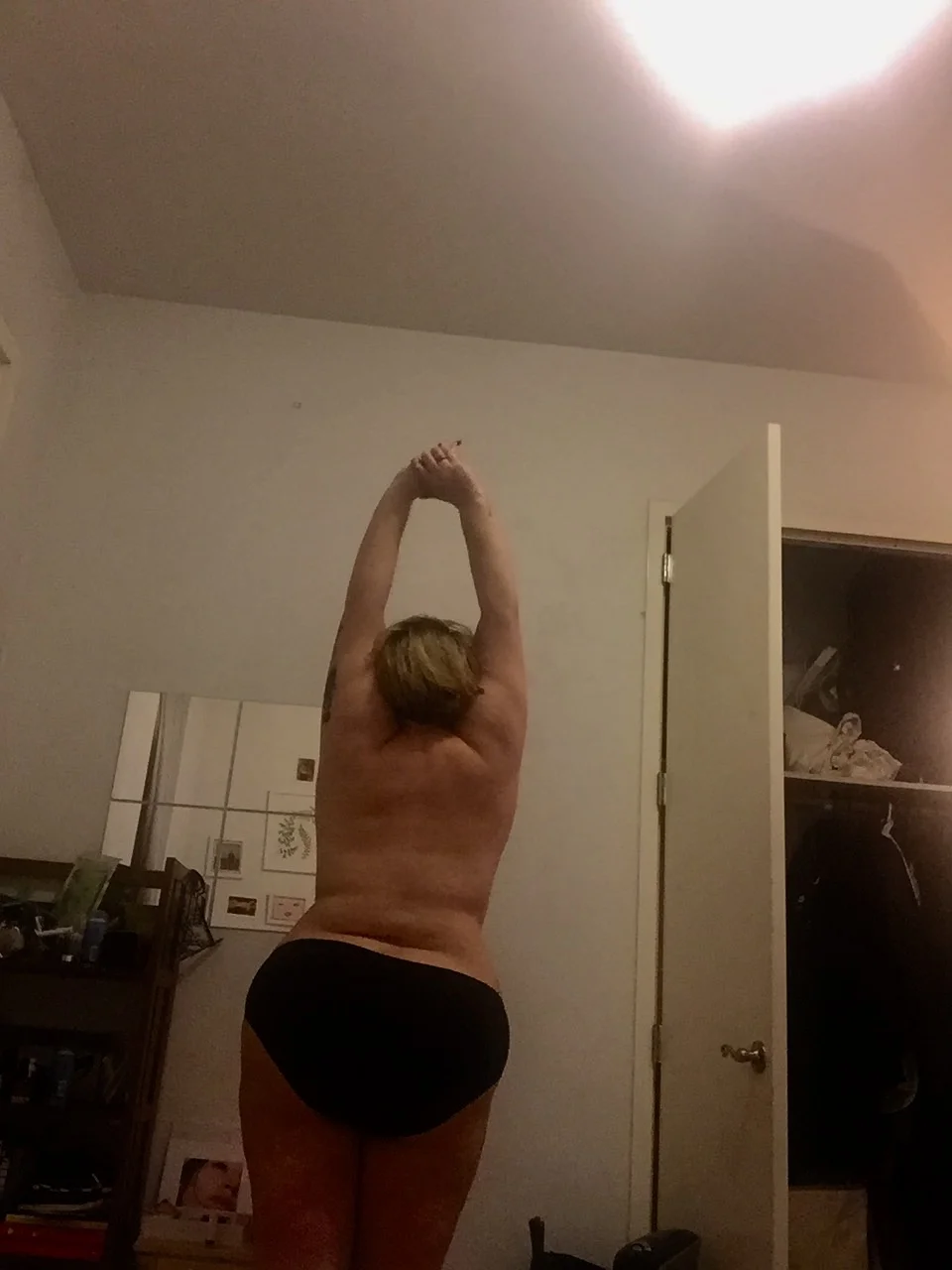 When done, look back at yourself in the mirror. Close your eyes and imagine yourself. Keep the image in your head. Take your hands and place them on the tops of your thighs. Say, whisper or think: I appreciate you carrying me through this world. I will be good to you. Take hands and place them on your chest. Say, whisper or think: I believe in your decisions. I will be good to you. Take hands and place them on your lower back/top of ass. Say, whisper or think: Thank you for giving me stability. I will be good to you. Take hands and place them on your belly. Say, whisper or think: I hold you dear and you bring me comfort. I will be good to you. Open your eyes.